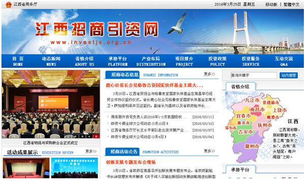 据了解,江西招商引资网由省商务厅指导,江西省投资促进局主办,是目前江西省省级层面唯一独立域名官方专业招商引资网站。网站内容展示主要包含动态新闻、省情介绍、承接平台、产业布局、项目推介、投资政策、投资服务、互动交流8大版块。网站目前设置了中文简体和繁体版。