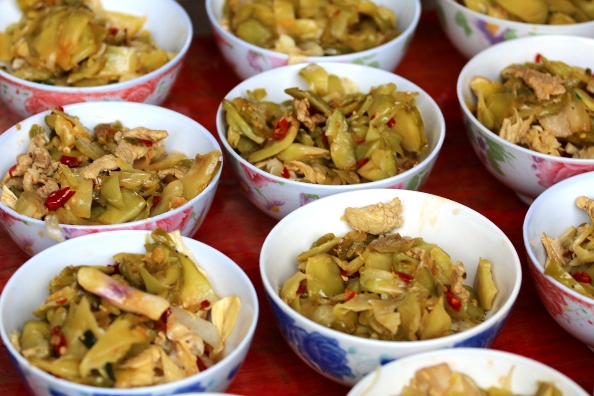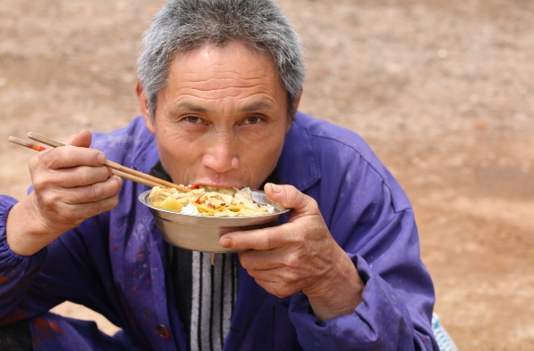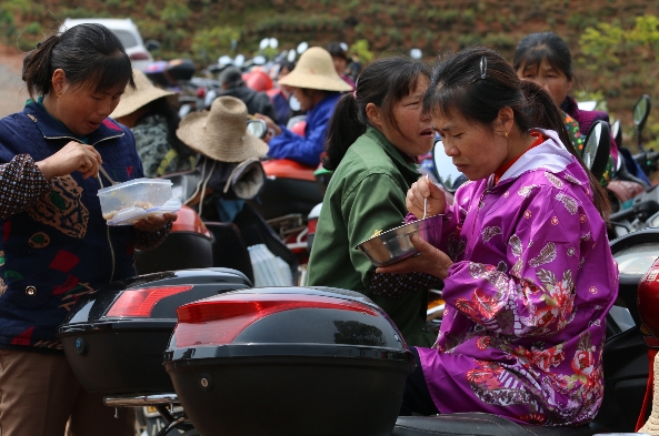 【香港商報網訊】2016年3月27日,在江西遂川縣雩田鎮狗牯腦黃金茶產業基地裏,請來的采茶工忙完上午采采摘鮮葉後,中午紛紛返回基地吃起老板提供的免費吃飯,午餐並不豐盛,無外乎就是一些蔬菜,加點肉。但在午餐時間裏,采茶工難得的休息時間,一邊自由站著、坐著吃飯,一邊開玩笑,嘮家常,不時還能聽見采茶工發出爽朗的笑聲,他們忘卻了采茶的辛苦。