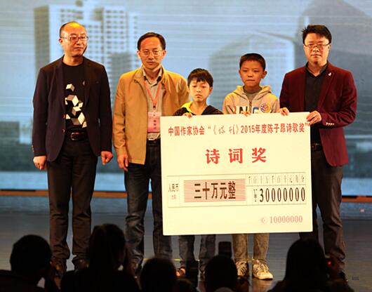 【香港商報網訊】記者金山報道:4月6日,由中國作家協會《詩刊》社、中共四川遂寧市委宣傳部、遂寧市文化廣電新聞出版局聯合舉辦的“中國作家協會《詩刊》2015年度陳子昂詩歌獎”頒獎活動在遂寧國際會展中心舉行。著名詩人、中國作家協會副主席、書記處書記吉狄馬加、四川省委宣傳部副部長趙明仁、《詩刊》常務副主編商震、遂寧市市長趙世勇、省文化廳領導及全國著名詩人、詩歌理論家、評論家等出席了本次頒獎活動。