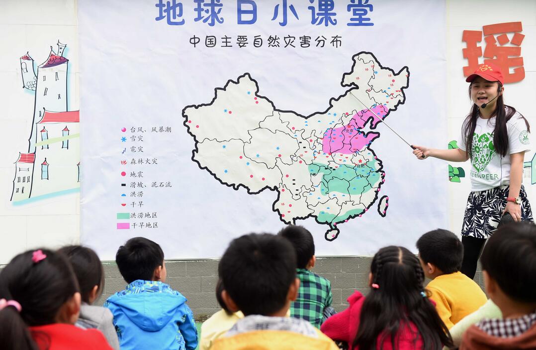 【香港商報网訊】通訊員 解琛 報道:4月21日,合肥市瑤海區鳳陽一村快樂兒童俱樂部,環保志愿者在“地球日小課堂”上向小朋友講解中國主要自然災害的分布。小朋友們共同在巨幅的地球圖形上按上彩色手印為“地球添加色彩”。