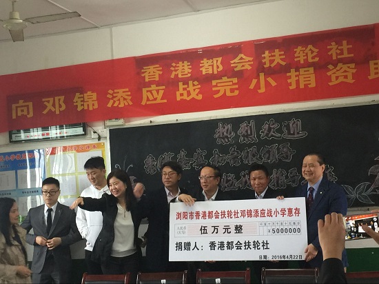 鄧錦添博士捐贈助學儀式上,捐贈了5萬人民幣現金。多年來,香港都會扶輪社為瀏陽市淳口鎮應戰小學捐贈現金50多萬元。