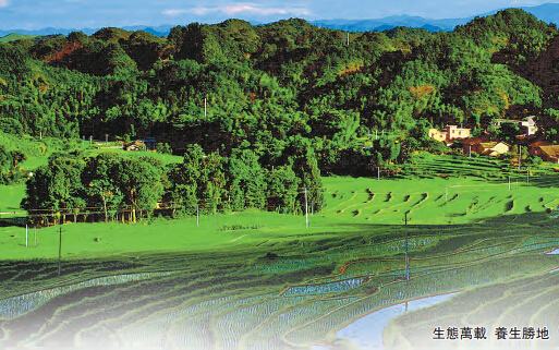 生态万载:中国绿色名县,全县生态环境良好,森林覆盖率达67.27%,负氧离子含量6万个每立方厘米,被誉为「天然氧吧」,九龙休闲度假旅游区森林覆盖率高达92%。