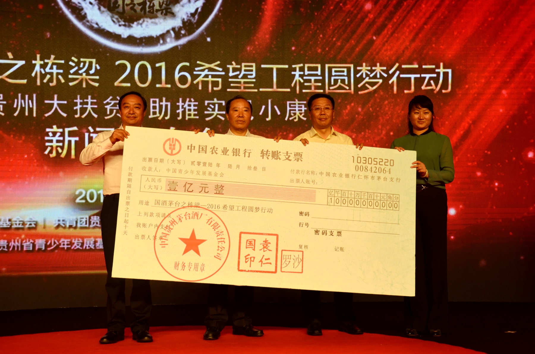 【香港商報网訊】 記者 黃慶松 報道:6月13日,“國酒茅臺·國之棟梁——2016希望工程圓夢行動”暨“參與貴州大扶貧,助推實現小康夢”新聞發布會在貴陽孔學堂隆重召開。中國貴州茅臺酒廠(集團)有限責任公司向中國青少年發展基金會、共青團貴州省委捐資1億元人民幣,幫助20000名貧困家庭的大學新生圓夢大學,解決他們從家門到校門的困難。