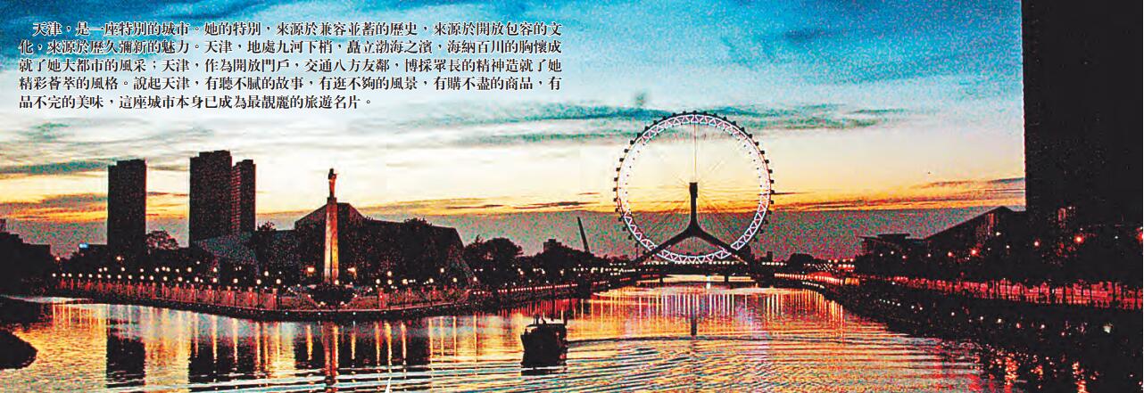 天津,是一座特別的城市。她的特別,來源於兼容并蓄的歷史,來源於開放包容的文化,來源於歷久彌新的魅力。天津,地處九河下梢,矗立渤海之濱,海納百川的胸懷成就了她大都市的風采;天津,作為開放門戶,交通八方友鄰,博采眾長的精神造就了她精彩薈萃的風格。說起天津,有聽不膩的故事,有逛不夠的風景,有購不盡的商品,有品不完的美味,這座城市本身已成為最靚麗的旅游名片。