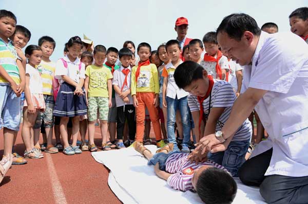 【香港商報網訊】通訊員解琛報道:6月30日,在合肥市瑤海區大興鎮東風小學,醫務人員現場教授孩子們防溺水安全急救技能。