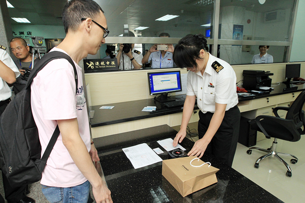 鮑先生高興地告訴告訴記者,他在珠海旅遊期間在珠海吉大免稅商場購買了價值690元的卡西歐手表,經九洲港客運口岸離境時,主動向海關提出退稅申請,很快就辦完了離境退稅手續,而且成為了首個獲得離境退稅的旅客。