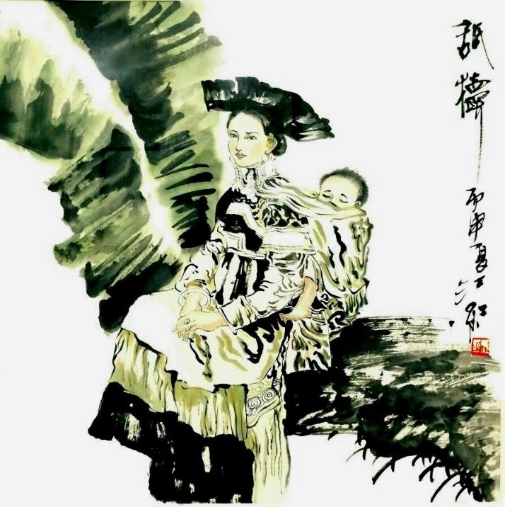 畫家江紅女士的展品,“舐犢”寓意,紅軍途中的一位少數民族年輕母親,在操持家務及關愛革命後代的同時,想念著自己投軍長征遠方的丈夫,並期盼早日勝利榮歸。她那頗具典型的民族服飾,後背的孩子及籮筐,非常具有民俗及地域代表性。
