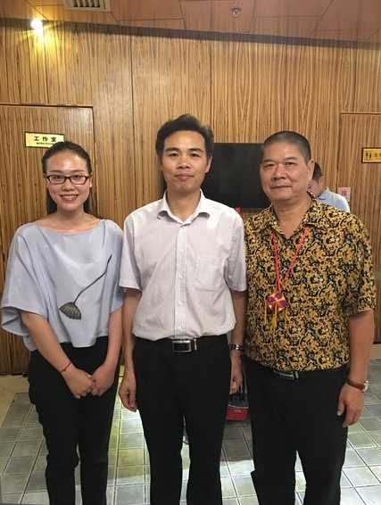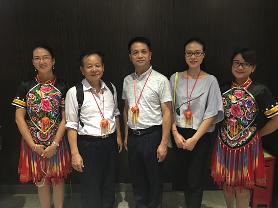 第一灣股份公司運營總監邱文成(左)、東蘭潤通國際旅行社總經理覃源(右)向河池市人民政府副市長陸海生(中)彙報東蘭旅遊開發進展情況並合影留念