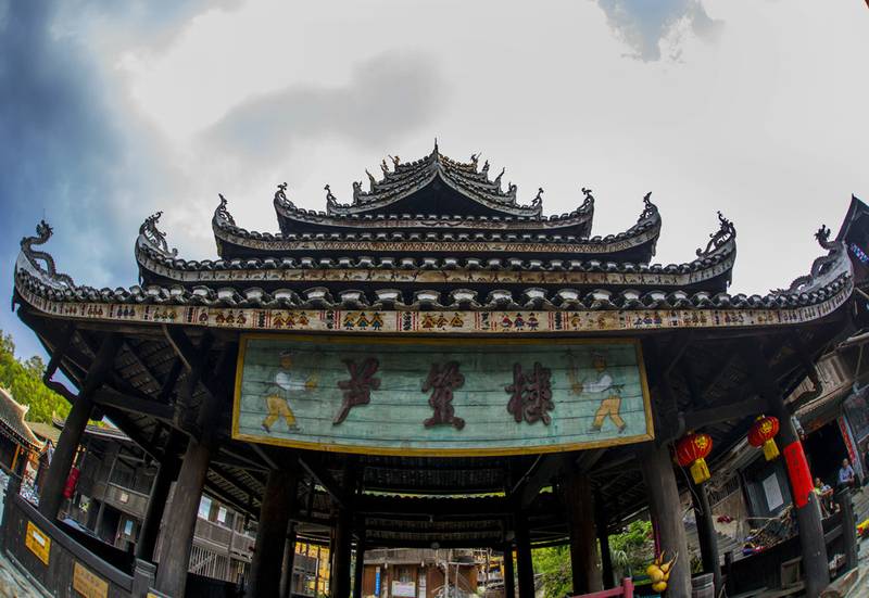 在芋頭侗寨有太和鼓樓、蘆笙鼓樓、崖上鼓樓、龍脈鼓樓四座鼓樓。蘆笙鼓樓的建筑工藝是侗族建筑文化的經典,全木結構,不用一釘一鉚,樓身結構精巧,造型典雅端莊。這座蘆笙鼓樓每層的裝飾畫和四角龍鳳造型都各不相同,足見工匠之巧思。