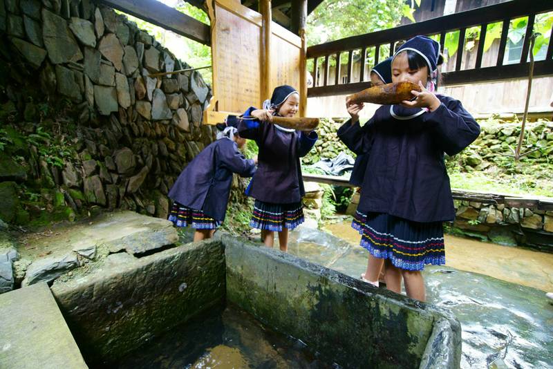 侗寨的涼亭多建于山坳或路旁,供行人乘涼歇息之用,亭畔多古樹遮蔭。坐在涼亭的長凳上,喝著純凈的泉水,渾身疲勞頓消。