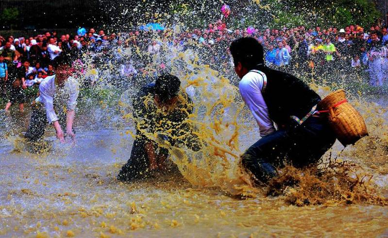 “搶魚塘”是一項妙趣橫生、具有濃郁民族特色的體育活動,男女都可以參加,規則簡單粗暴:就是搶!搶到就可以回家加餐咯!