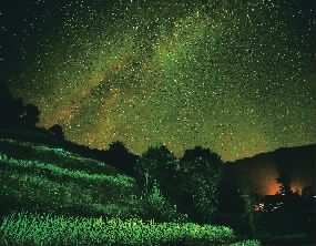 夏天的紫鵲界,佳禾吐翠,如排排綠浪,青翠欲滴,似從天而瀉的一彎彎碧玉。夜晚,天上的繁星與星星點點的燈光一起閃爍,仿佛置身于一座幽深空蒙的世外桃源。在這里,沒有城市的光污染,每一個觀景臺都是一個絕佳的觀星點。隨意擇一處,支起帳篷和腳架,調整好相機靜靜守候,待群星璀璨之時,定格那美麗的星空畫卷。