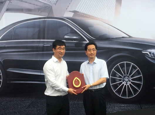 廣西壯族自治區副主席張曉欽(右)向北京梅賽德斯-奔馳銷售公司蘇海濤頒發榮譽牌匾