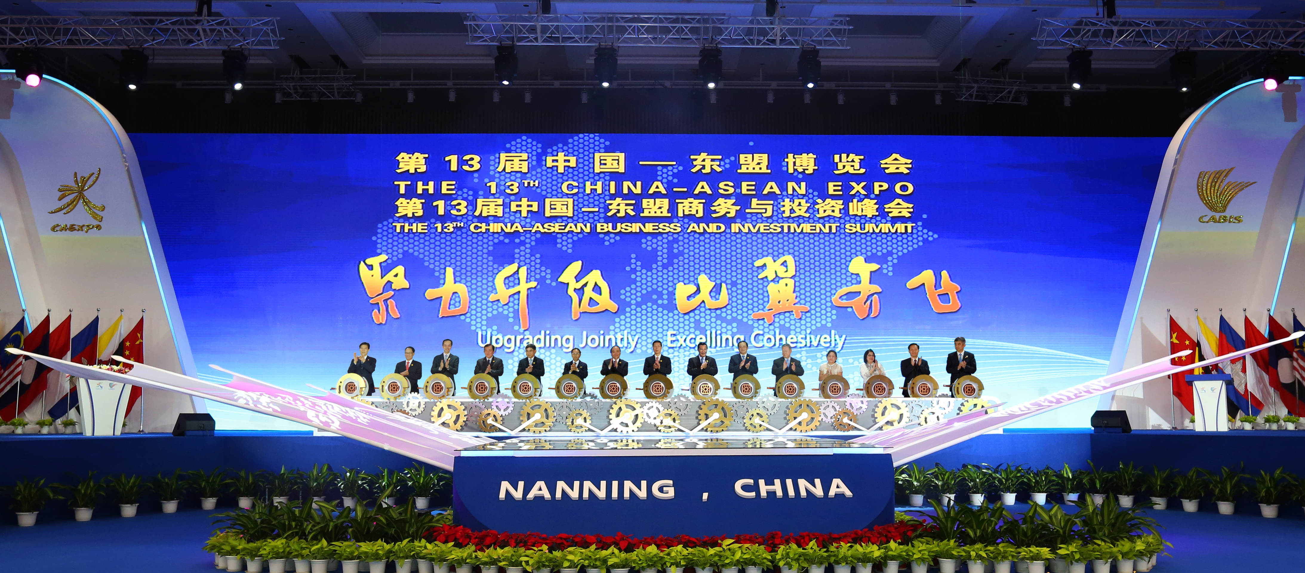 隨著張高麗宣布第13屆中國—東盟博覽會、中國—東盟商務與投資峰會開幕,15位啟幕嘉賓共同搖動手柄啟動“合作引擎”,一對巨大的“合作之翼”在屏幕上徐徐展開,本屆開幕大會“聚力升級,比翼齊飛”主題隨即浮現屏幕,寓意中國—東盟命運共同體凝聚合作之力,借力信息化、智能化,將中國—東盟國際產能合作從傳統產業向現代產業升級。
