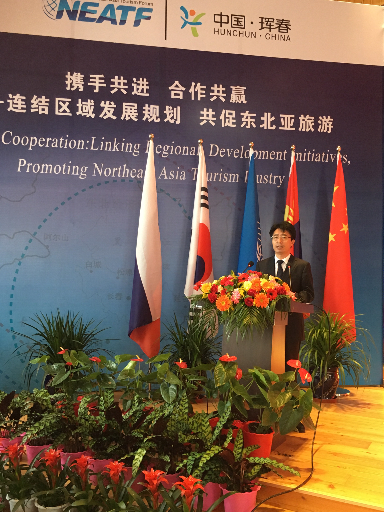 論壇開幕式上,吉林省旅游局副局長陳守君做了主旨演講,他表示“十二五”期間,吉林省旅游業取得了長足的發展與進步。旅游投資累計到位資金達到1288.2億元;全省航空旅客吞吐量達到1059.6萬人次;旅行社總量達到1032家。旅游業從經濟邊緣向主戰場轉變,旅游經濟成為全省經濟增長的新亮點。琿春市委書記高玉龍在歡迎辭中談到,今后一個時期,琿春將深入貫徹實施國家的“一帶一路”“東北再振興”和沿邊開發開放等國家重大戰略,把旅游業作為琿春經濟發展的“引擎”,與東北亞各邊境城市一道,共同做好旅游這篇大文章。