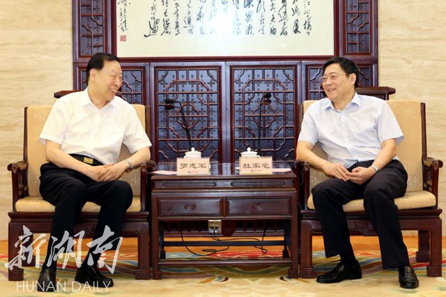 9月19日晚上,省委書記杜家毫在長沙會見了全國人大環資委副主任委員羅志軍率領的調研組一行。記者 羅新國 攝