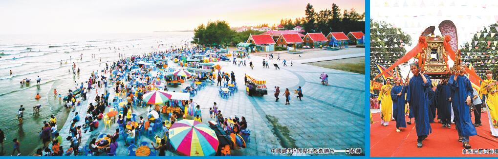 防城港有「上山下海出國」的特色旅游品牌,全市景區景點達60多個,A級景區達12家,其中十萬大山雄奇秀美,白浪灘風光旖旎。而一旦來到東興口岸,人們盡可領略中越邊境的异國風情。中斷八年的出入境异地辦證業務恢復,東興口岸啟動外國人口岸簽證業務,全市累計接待游客人數突破5000萬人次,「上山下海又出國」的旅游格局基本形成。
