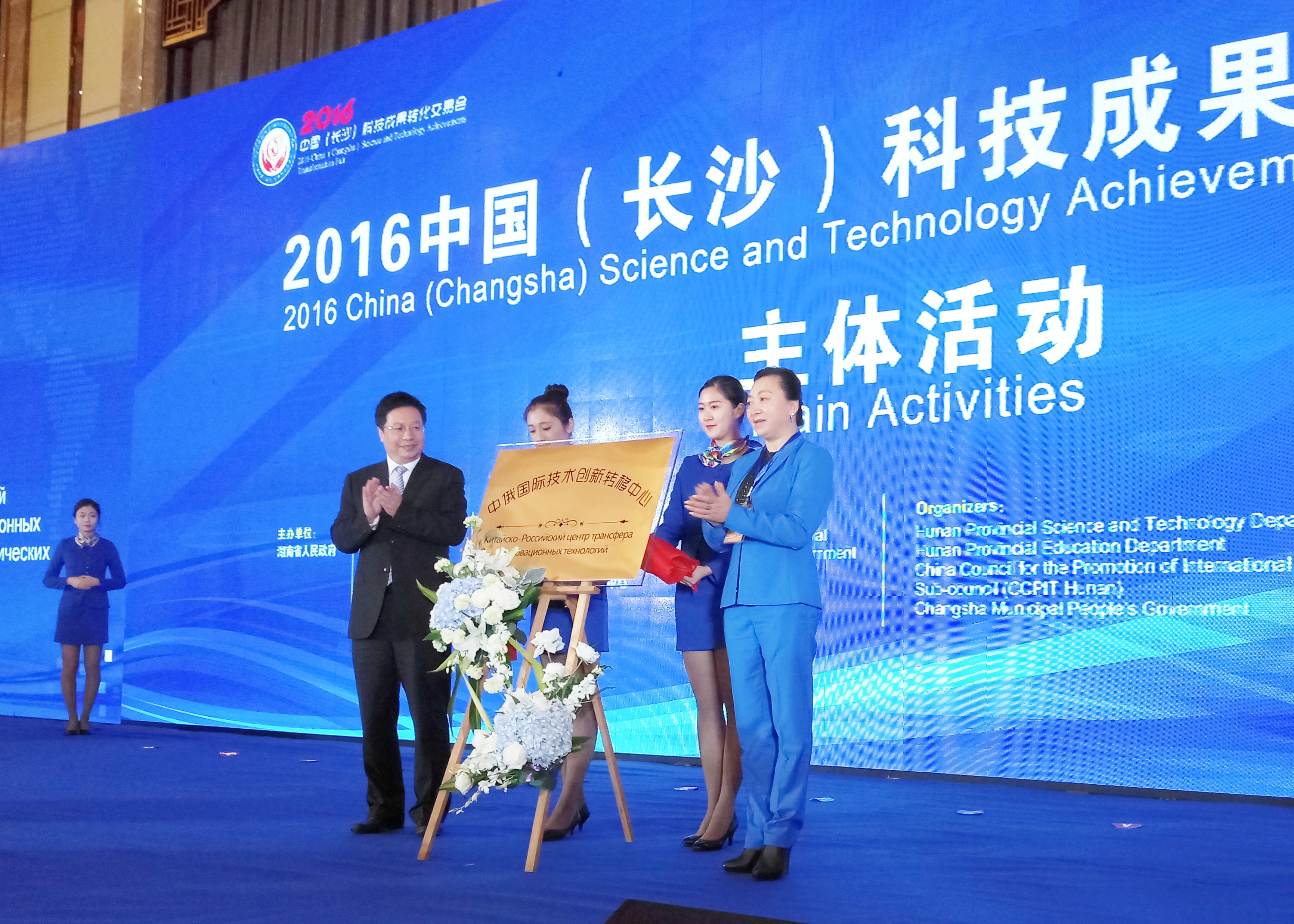 中共長沙市委副書記、市長胡衡華和俄中文化教育發展基金會會長崔姍為“中俄國際技術轉移創新中心”進行揭牌