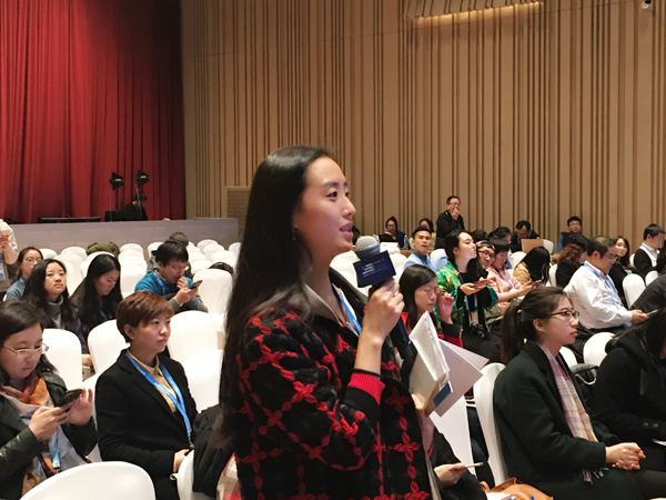 香港商報記者吳夢琪在浙江省資訊產業領軍企業家代表記者見面會上提問數夢工廠首席執行官兼總裁吳敬傳女士。