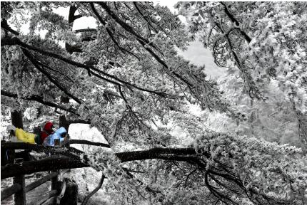 黃山冬雪不同於北國的冬雪,它不是那種厚重嚴實,能把大地包裝成一片銀白,並且持久不化的雪;黃山的冬雪,妙就妙在雪與黃山的松、石、雲、泉巧妙而完美的結合。雪後的黃山,增添了無限的風采——劈地摩天的天都峰宛如銀妝素裹的神女;隔壑相望的蓮花峰,如同一朵盛開的雪蓮;九龍峰變成了一條蜿蜒騰飛的玉龍,飛舞在黃山雲海之上;西海群峰的石林,像一尊尊身著素服的神仙,聚集在峰頭之上;冰雪覆蓋的獅子林,銀巒相擁的玉屏峰,構成了一幅幅動中有靜,靜中有動的絕妙畫圖……於是,冬遊黃山的人們發出了感歎:“黃山四季皆美景,惟有臘冬景更佳。”