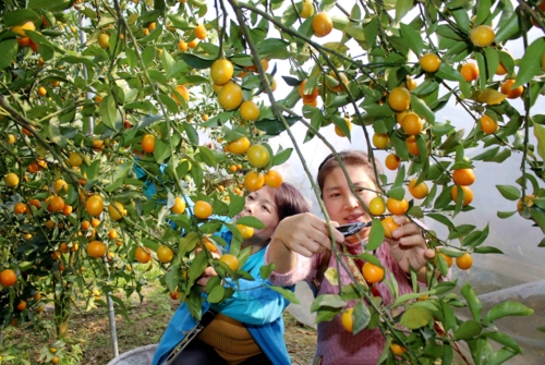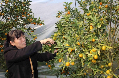 【香港商報網訊】2016年12月26日,桔農在江西省遂川縣大坑鄉金桔大棚裏采摘金桔。當前正值金桔收獲的季節,目前江西省遂川縣擁有金桔基地面積達12萬畝,掛果8萬多畝,當地桔農搶抓農時,采摘金桔,搶占新年金桔銷售旺季,力爭取得好收成,種植金桔成為當地群眾增收致富的主渠道之一。(李建平攝)