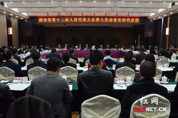湖南省十二屆人大七次會議長沙市代表團審議政府工作報告。