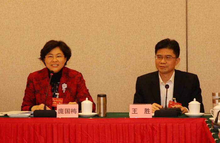 云浮市委書記龐國梅(左)、市長王勝(右)在廣東省第十二屆人民代表大會第五次會議云浮代表團分組討論會議上。(云浮日報記者劉爍攝)