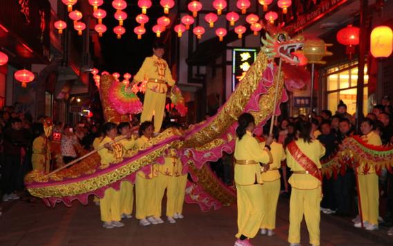 晚上活动更是精彩迭出,传统猜灯谜、舞龙舞狮、唱地花鼓、打土地表演在乔口古镇内街轮翻上演,既弘扬了本土民俗文化,又找寻了儿时的记忆,更增强了节日欢乐、祥和的气氛。