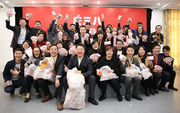 【香港商报网讯】记者吴梦琪报道:现金堆成山,员工们拿着麻袋来装钱……今天是38女神节,一大早,朋友圈就被盘石公司壮观的场面持续刷屏,这次盘石公司的女神节不仅送玫瑰送施华洛世奇,关键发放了数千万的现金红包,而且男男女女都有份,此次发到钱的员工,多则好几百万,可不需要麻袋才装得下吗?