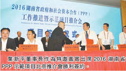 2016年集團實施「六大戰略合作」,主動適應供給側結構性改革,全年承接PPP項目35個,任務量251.3億元,成立SPV公司26家,項目涵蓋市政、水利、智慧城市、學校等領域。出台《PPP項目經營管理辦法》等規定,為經營轉型提供制度支持。廣東中山翠亨新區環島路、張家界市武陵山大道、貴州黔西縣教育園區、桃源智慧城市等一批PPP項目,均有較大的社會影響和預期可觀的經濟效益。