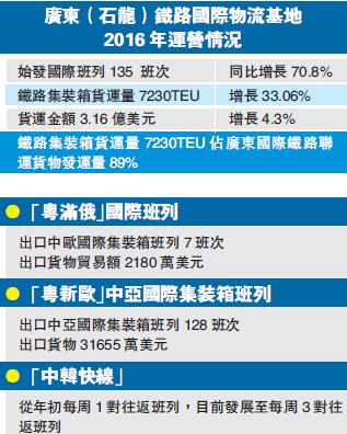 2013年底開始,「粵新歐」「粵滿俄」等國際鐵路聯運專列相繼在基地開通;2015年,從基地始發的國際貨運專列再添新成員——「中韓快線」,目前「中韓快線」從最初每周1對往返班列發展至每周3對往返班列;去年4月14日,始發石龍的中歐班列目的地延伸至德國杜伊斯堡,全長13488公裏,全程耗時19天比海上運輸節約15天時間,成為國內運距最長的中歐班列,並被納入全國中歐班列統一品牌;目前「粵新歐」國際鐵路專列實現每周3列,取得中歐班列序列號,正式納入全國鐵路運行版圖,成為廣東省加快構建連接「一帶一路」國際多式聯運跨境樞紐的重要裏程碑。隨著「粵新歐」「粵滿俄」、「中韓快線」的開通及班列的不斷增多,廣東(石龍)鐵路國際物流基地成為廣東面向中亞、俄羅斯、東南亞的「橋頭堡」。此外,去年,石龍港水路貨運(二類)口岸正式獲批同意對外開放,石龍鎮初步形成了鐵路、水路口岸對外開放的立體格局。
