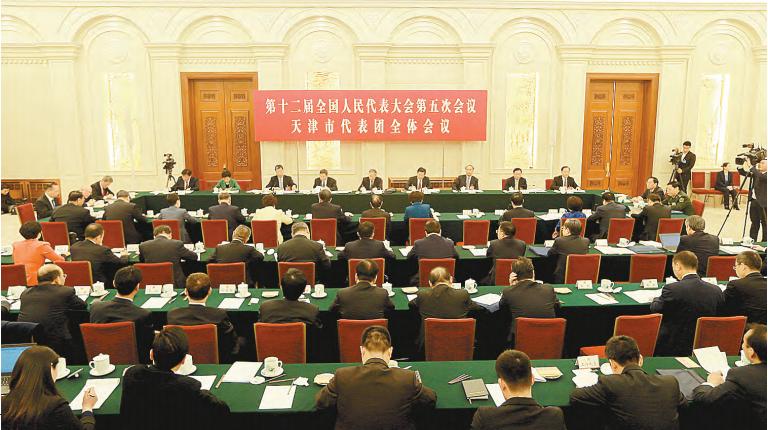 3月7日上午,人民大會堂天津廳,一座充滿自信、散發獨特魅力的城市,吸引著人們的目光。十二屆全國人大五次會議天津代表團在人民大會堂天津廳舉行全體會議,并對境內外媒體開放。采訪全國兩會的76家境內外媒體的140多名記者到會旁聽天津代表團審議,聚焦