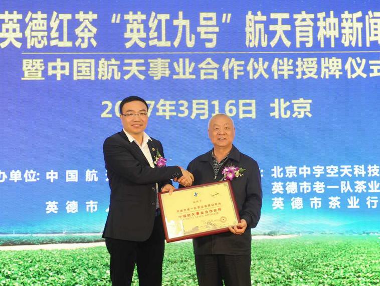 【香港商報網訊】記者餘文蓮 日前,廣東英德紅茶“英紅九號”航天育種新聞發布會暨“中國航天事業合作夥伴”授牌儀式,在北京航天城舉行。中國航天基金會授予廣東英德市老一隊茶業有限公司“中國航天事業合作夥伴”牌匾,同時將50克英德紅茶“英紅九號”航天種子順利交回英德。