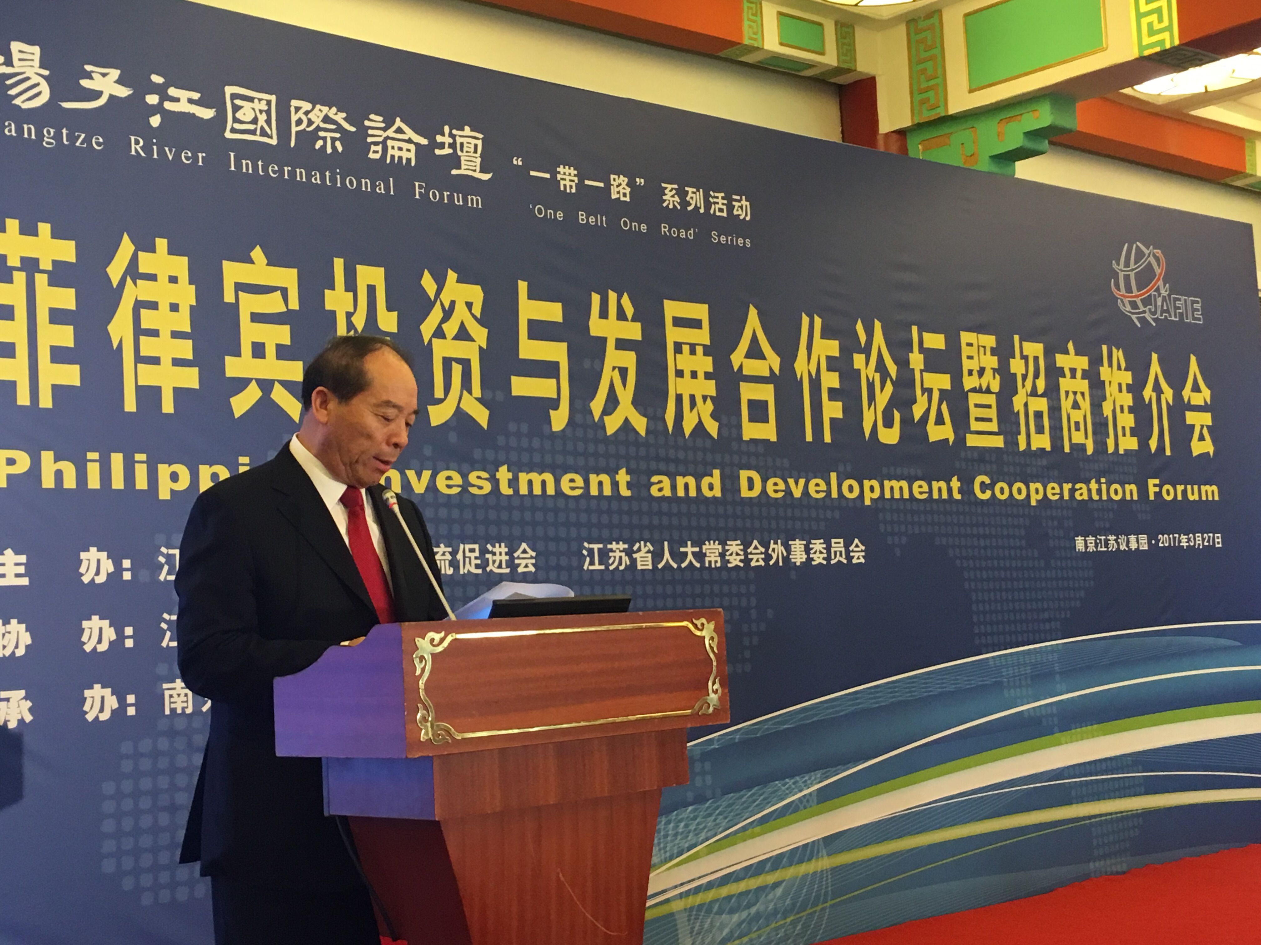 【香港商報網訊】記者杜林、宋璟報道:3月27日,由江蘇省對外友好交流促進會與江蘇省人大常委會外事委員會主辦的揚子江國際論壇“一帶一路”系列活動——菲律賓投資與發展合作論壇暨招商推介會在南京舉辦。江蘇省對外友好交流促進會會長林祥國表示,此次論壇的舉辦,搭建了江蘇與菲律賓有關地區經濟交流合作的平台,江蘇企業家看好菲律賓經濟發展前景,希望與菲律賓在多領域展開深入合作。