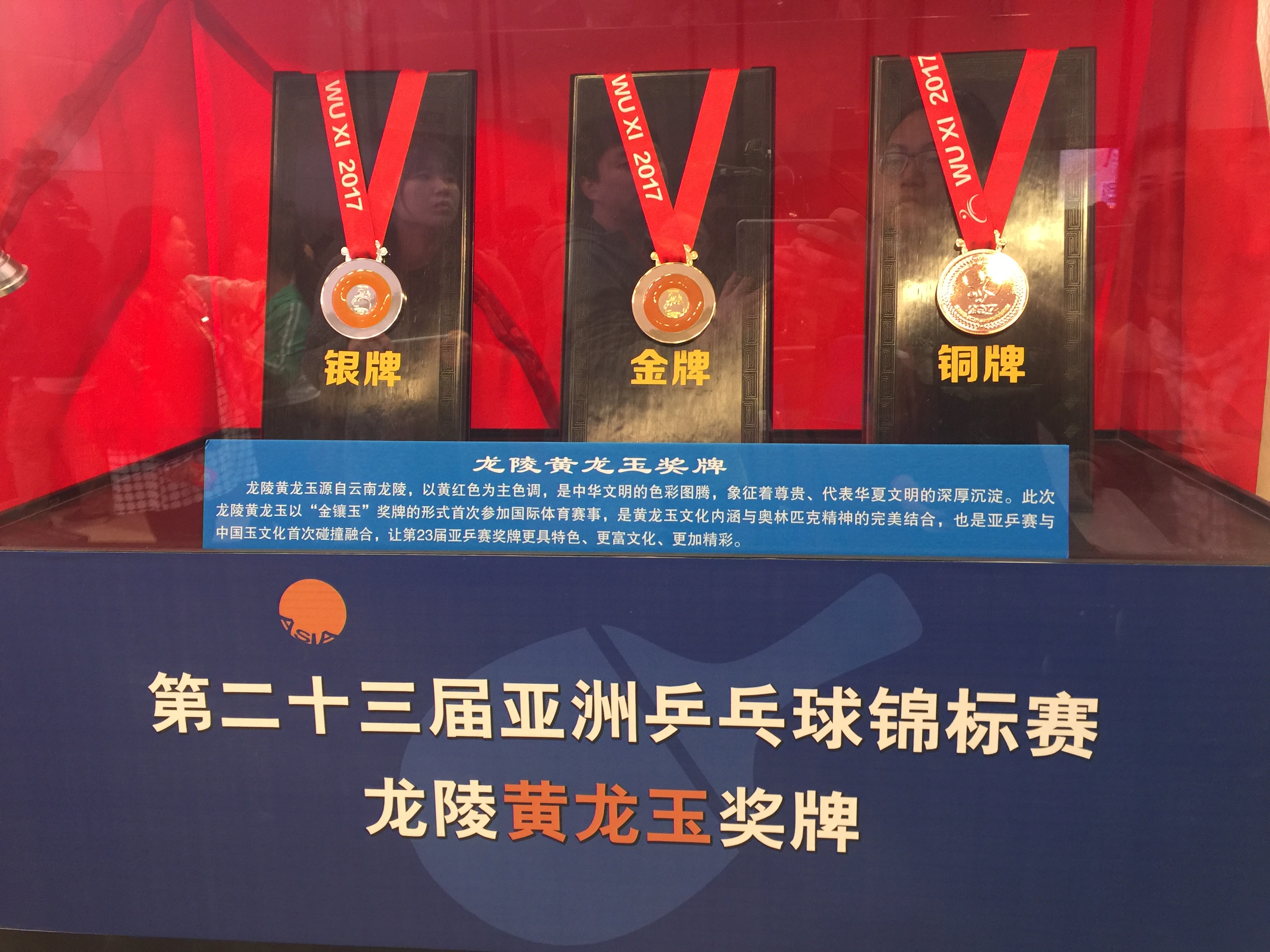 本次新聞發布會還首次展示了2017年亞洲乒乓球錦標賽獎牌,龍陵黃龍玉獎牌直徑70mm,厚度7mm,重180餘克。獎牌的正面是亞洲乒乓球錦標賽統一的圖案;獎牌的背面鑲嵌經過精心挑選制作的黃龍玉,黃龍玉呈圓環型狀,外環直徑50mm,內環直徑26mm;圓環正中的金屬圖案是本次大賽徽標;獎牌掛鉤是由兩只經過變形演變的金雞組成的紋飾。