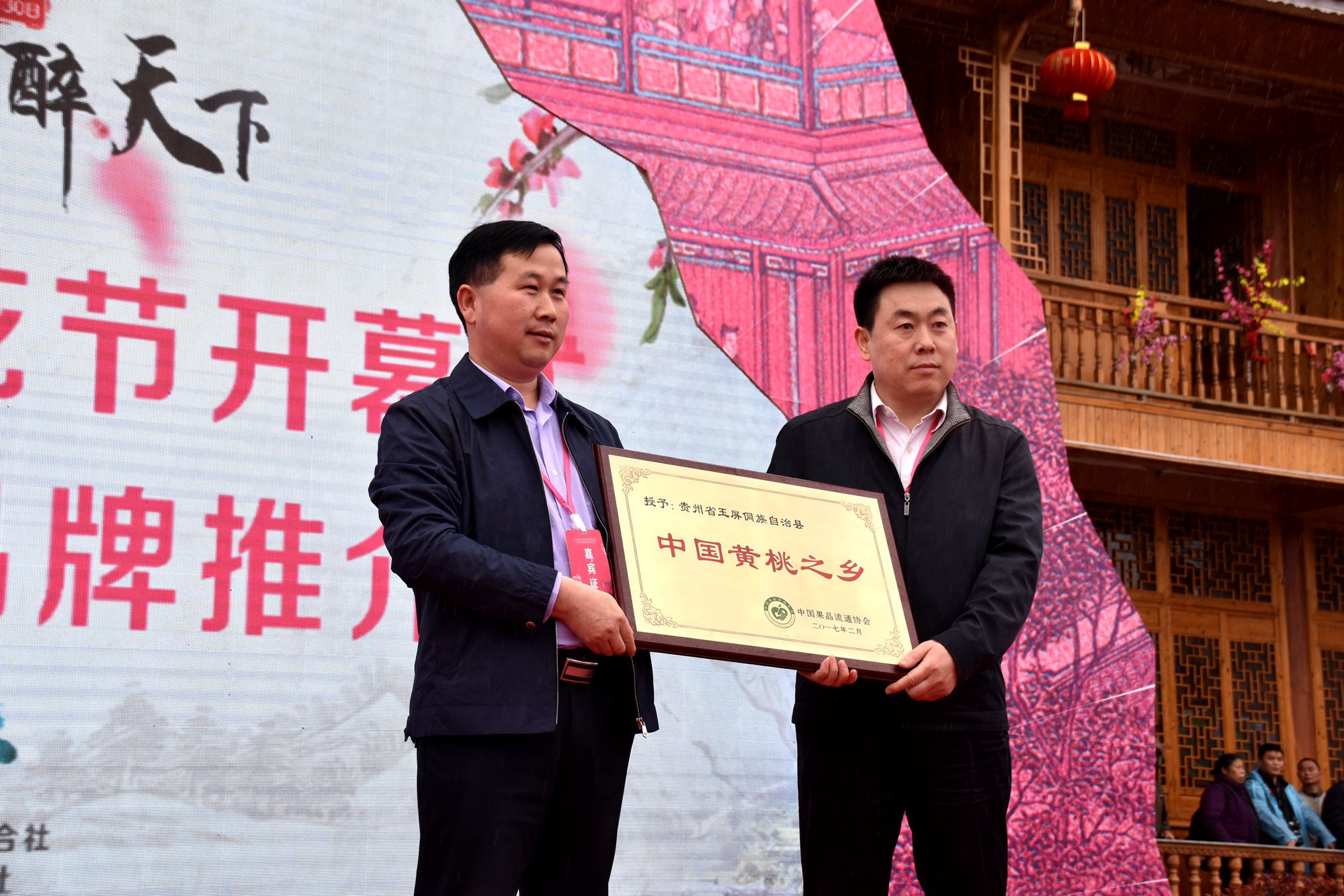 隨後,中國果品流通協會常務副秘書長張慶豐代表協會向玉屏授予“中國黃桃之鄉”牌匾,副縣長楊代軍接牌。授牌儀式過後,市委常委、縣委書記王俊銘宣布“花開玉屏·桃醉天下”2017貴州玉屏首屆桃花節暨玉屏皇桃品牌推介會開幕。