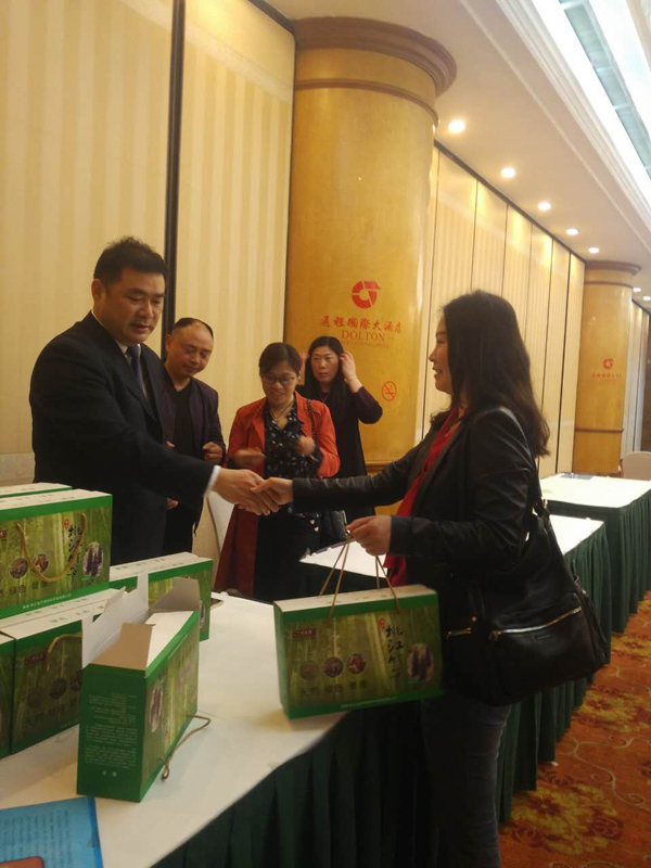 桃江县人民政府县长黄劲(左)向来宾推介桃江竹笋