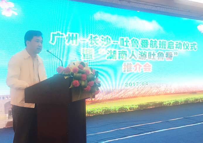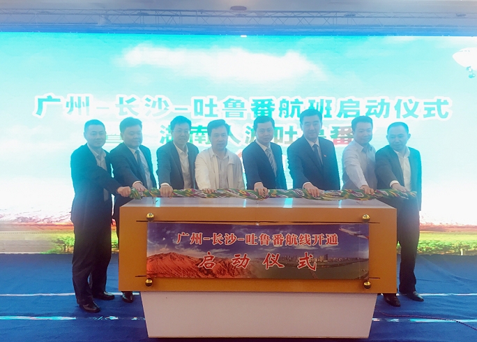 【香港商报网讯】香港商报记者张思静报道:4月17日上午,广州-长沙-吐鲁番航班启动仪式暨“湖南人游吐鲁番”推介会在长沙召开。从今天起,长沙将开通直飞吐鲁番航线,4个小时即可到达。这对进一步促进援疆工作开展,助推湘吐两地旅游发展具有重要意义。