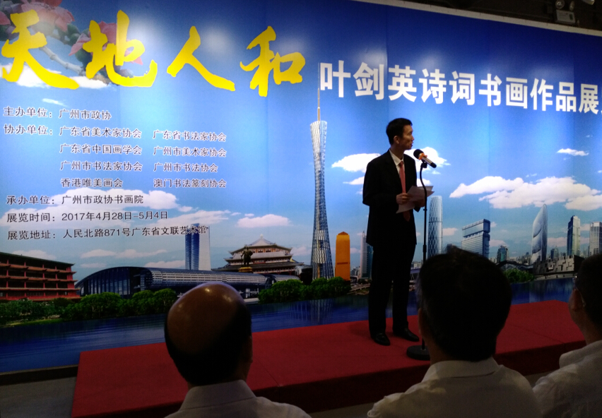 【香港商報網訊】記者李苑立報道:4月28日至5月4日,由廣州市政協主辦,廣東省美術家協會、廣東省書法家協會、廣東中國畫學會、廣州市美術家協會、廣州市書法家協會、廣州市書法協會、香港唯美畫會、澳門書法篆刻協會共同協辦,廣州市政協書畫院承辦的“天地人和——葉劍英詩詞書畫作品展覽”在廣東省文聯藝術館舉行。