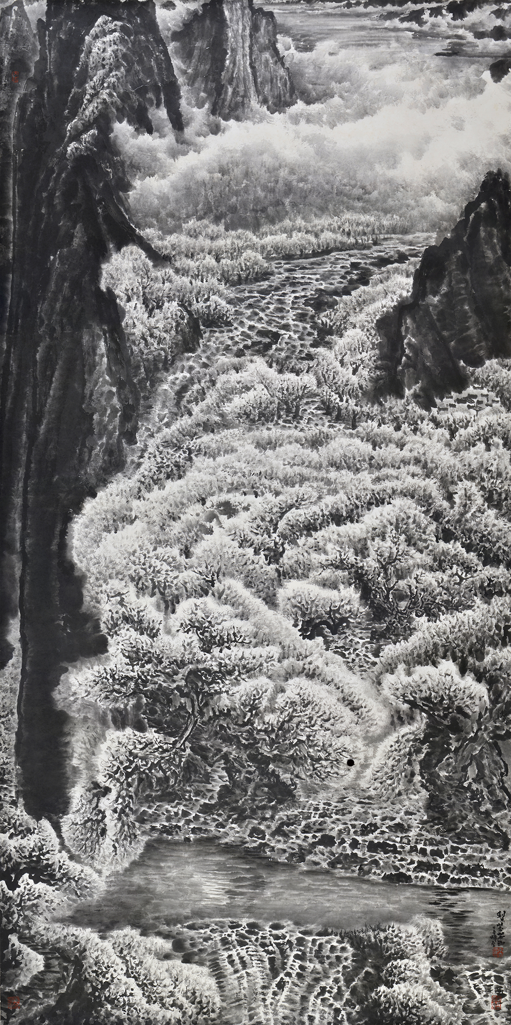 “只有積墨能表現出山河的蒼潤、雄奇與厚重。其山水注重墨色的厚重,行筆有度,筆筆有力,‘由幹入潤,由潤入幹’,反複交替進行,墨色生動。”來支鋼在采訪中表示,積墨成之於畫,山水陰陽向背分明,樹石蒼鬱深邃突出,溝壑虛實掩映有度,雲煙縹緲自然。