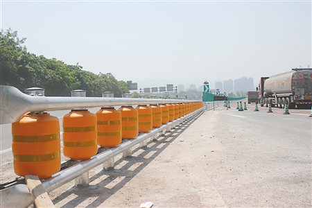 據了解,該護欄上的旋轉筒采用高強度複合材料,防撞耐磨且恢複力強,可以有效起到泄力、導向作用,將汽車撞擊力轉變為旋轉動能,大大減輕交通事故造成的損害。