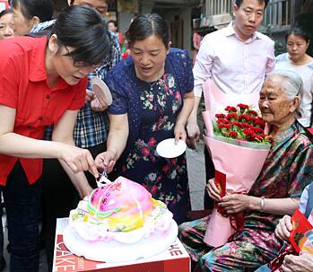 5月18日,南昌市東湖區上鳳凰坡社區的居民為104歲的鄧大英和100歲的張發娣兩位百歲老壽星慶生,居民們獻鮮花、送蛋糕,共同祝福老人幸福安康。