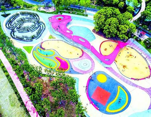 湖北日報訊 昨日,湖北首個“海綿江灘”——武漢市青山江灘二期正式對市民開放。圖為孩子們在江灘兒童游樂廣場嬉戲。該工程七成以上的鋪裝采用了透水性材料,通過雨水收集、過濾系統為周邊植物提供水源,集休閑娛樂防洪功能于一體。