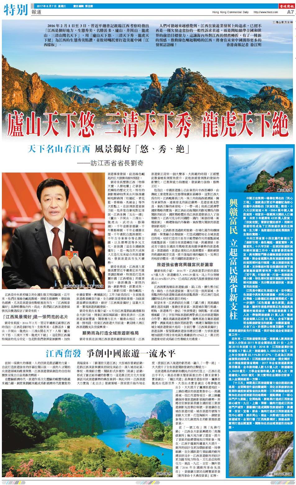 劉奇省長向本報介紹,6月份江西還將組織港媒和各大旅行社,到東江源采風踩線。劉省長表示,江西旅游資源豐富,開發潜力巨大,贛港山相近、水相連、情相通,投資江西旅游大有前途,歡迎港人到江西旅游觀光及投資興業。