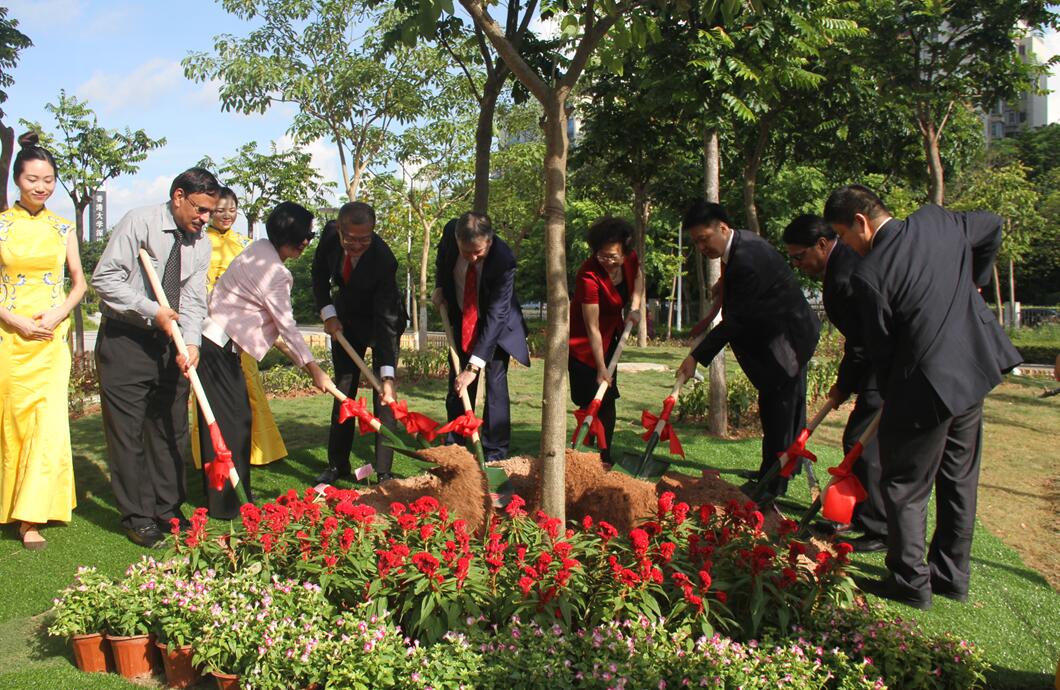 6月30日上午8點,深圳市副市長、香港大學深圳醫院董事長吳以環(右四)、香港大學校長馬斐森教授(左五)、市衛計委主任羅樂宣先生(右三)、市公立醫院管理中心張丹書記(右二)、香港大學深圳醫院院長盧寵茂教授(左四)等嘉賓為“綠色醫療 花香深港”紀念林揭幕。