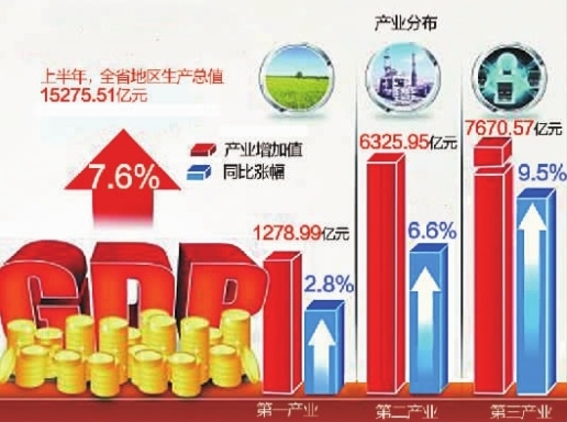 上半年,全省第一产业增加值1278.99亿元,增长2.8%;全省第二产业增加值6325.95亿元,增长6.6%;第三产业增加值7670.57亿元,增长9.5%,其中商品零售额、餐饮收入的增长都超过10%。