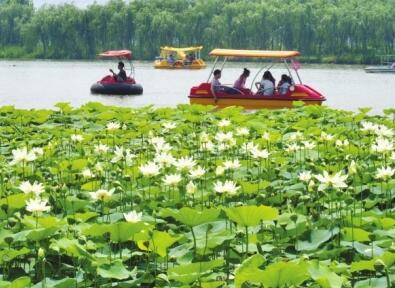 除了賞荷,游客還可以住在雅致的水上木屋,可以坐觀光車游黃河灘,乘腳踏船蕩舟湖中,還可以品嘗黃河鯉魚、荷葉香雞等特色美食,好不愜意。 (閆崇偉)