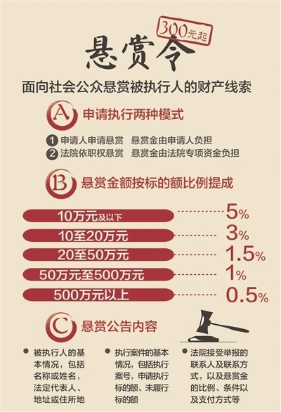 在網絡時代的今天,通過互聯網向社會發布公告,由社會公眾向網站提供老賴的財產下落或線索,網站按照公告規定的條件和標准,給予舉報人一定獎金的執行措施的方式,可以對隱藏、轉移財產的老賴產生心理壓力,使其有福不能享、有錢不敢花,有助於遏制其逃債行為,促使其自動履行債務。實行懸賞執行,有利於廣泛發動社會力量,查找老賴及其財產線索,破解具體案件執行難。