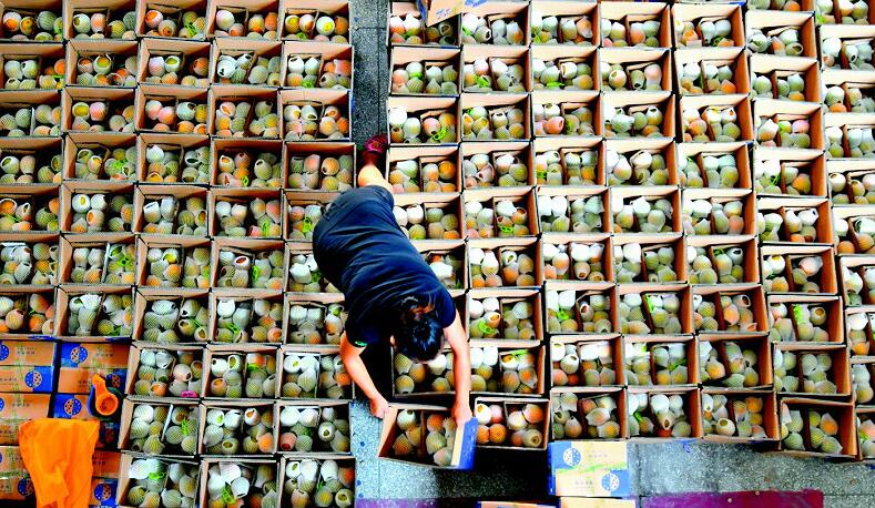 7月30日,秭歸縣茅坪鎮果農正將一早采摘的夏橙裝箱,通過電商平臺發往全國各地。今年秭歸夏橙豐收,產量突破3000萬公斤,但持續干旱對錯峰成熟的夏橙銷售產生一定影響,為了維護果農的利益,當地電商聯手,加大銷售力度,夏橙最高銷售價達到9元/公斤,平均銷售價達6元/公斤,目前夏橙銷售量占總產量的70%左右。(記者 劉曙松 視界網 余雪楠 攝)