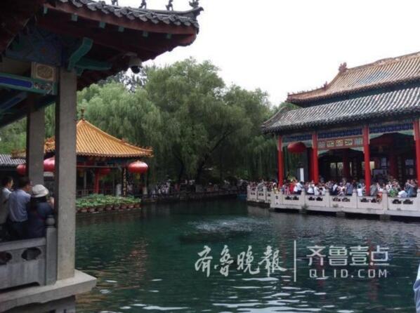位於黑虎泉西側的琵琶泉水的噴湧水量也增大了不少。記者看到琵琶泉水不斷從池底岩孔湧出,由北岸外溢,大量水流彙入護城河。泉水十分清澈,不少市民選擇來此打水。